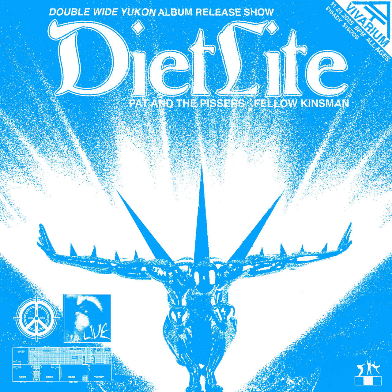 WEBSITEMilwaukee’s Diet Lite wasn’t a power trio by choice, at least not at first. However, when circumstances required they become one, Max Niemann and Kelson Kuzdas, the band’s dual-threat guitarists, made the unconventional decision to split up bass and guitar duties equally. And not only in the studio, but on the stage as well. This dynamic has become Diet Lite’s greatest asset: Evan Marsalli’s brutal drumming paired both guitarist’s ferocity on six and four strings, all giving way at any instant to an eccentric collage of old school punk, hooky power pop, psych freakouts, and good-old-fashioned rock ‘n’ roll. Add in the fact that all three members consistently pen songs for the group and you get quite the versatile outfit. The trio commits to as visceral and physically exhausting a live performance as possible, seemingly doing everything they can to make a crowd boil. Midwest punk-poet Thax Douglas said it best in a recent portrait of the band: “..it’s almost like the goddess of destruction destroyed herself, but not completely…” Double Wide Yukon, the band’s first collection of new material since 2023’s expansive Into The Pudding, captures this Jekyll-Hyde dynamic like never before. Written over a weeklong winter sojourn to the Wisconsin northwoods and recorded to analog tape at Jamdek in Chicago, with the goal of documenting an archetypal DL set (mid-set guitar-bass switch and all), nothing in their previous output has come this close to capturing the tenacity and reckless abandon Diet Lite brings to each performance.